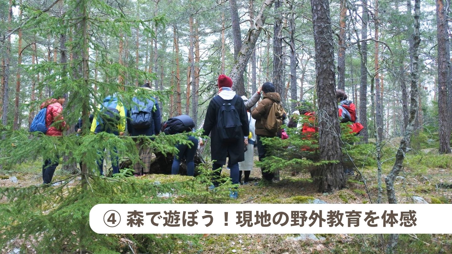 スウェーデンは自然との共生が進む環境政策の先進国でもあります。人々のライフスタイルも自然ととても調和的で、保育や教育の現場でも、野外での活動がたくさん行われます。自然享受権という権利があり、自生するベリーやきのこは誰が採ってもよく、自然の恩恵はみんなで分かち合うことが前提になっています。今回は湖のほとりの焚き火ができるスペースで、自然の中でのフィーカ(コーヒータイム+コミュニケーション)を楽しみつつ、現地の学校で行われている野外教育のアクティビティも体験します。