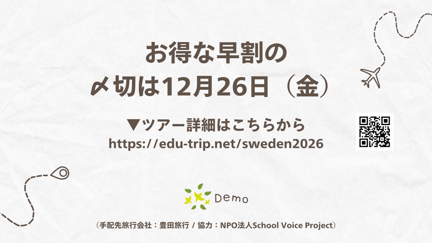 本ツアーはDemoが企画コーディネートし、NPO法人School Voice Project(SVP)が広報・PR協力をしています。 SVPのWEBアンケートサイト「フキダシ」登録者やオンラインコミュニティ「エンタク」メンバー向けの特別割引あり。