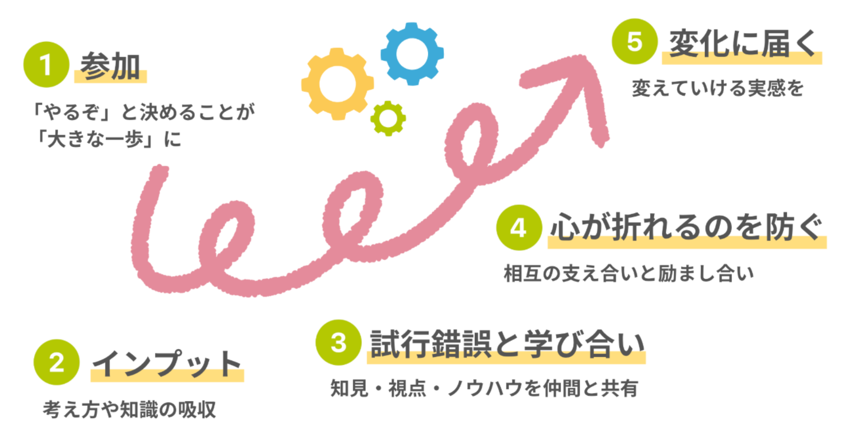 まず、「この期間、このテーマにコミットする」と決めるのがとても大きなことです。『エンジン』では序盤に"インクルーシブな学校・教室づくり"のための汎用的なノウハウや考え方をみんなで学び(Input)、それを踏まえて100日間のマイチャレンジを設定し、それぞれの職場で挑戦・実践をスタート。すぐにうまく行かずとも、試行錯誤を励まし、フィードバックをくれる場があることで心が折れるのを防ぎ、変化を目指して歩んでいけるよう支えます。