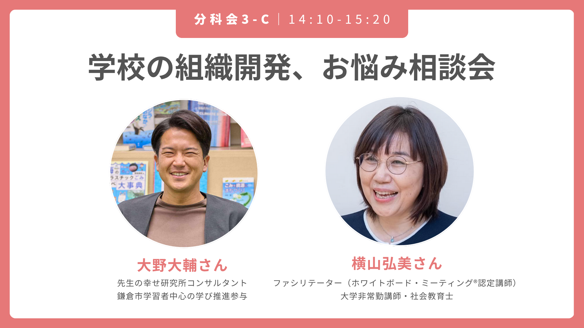 学校には様々な組織的な課題があります。「どうにかしたいけど、何からどうすれば...」と感じること、ありますよね。横山さんのファシリテーションのもと、全国の数多くの学校の改革に伴走している大野さんにリアルな悩みを相談してみませんか?