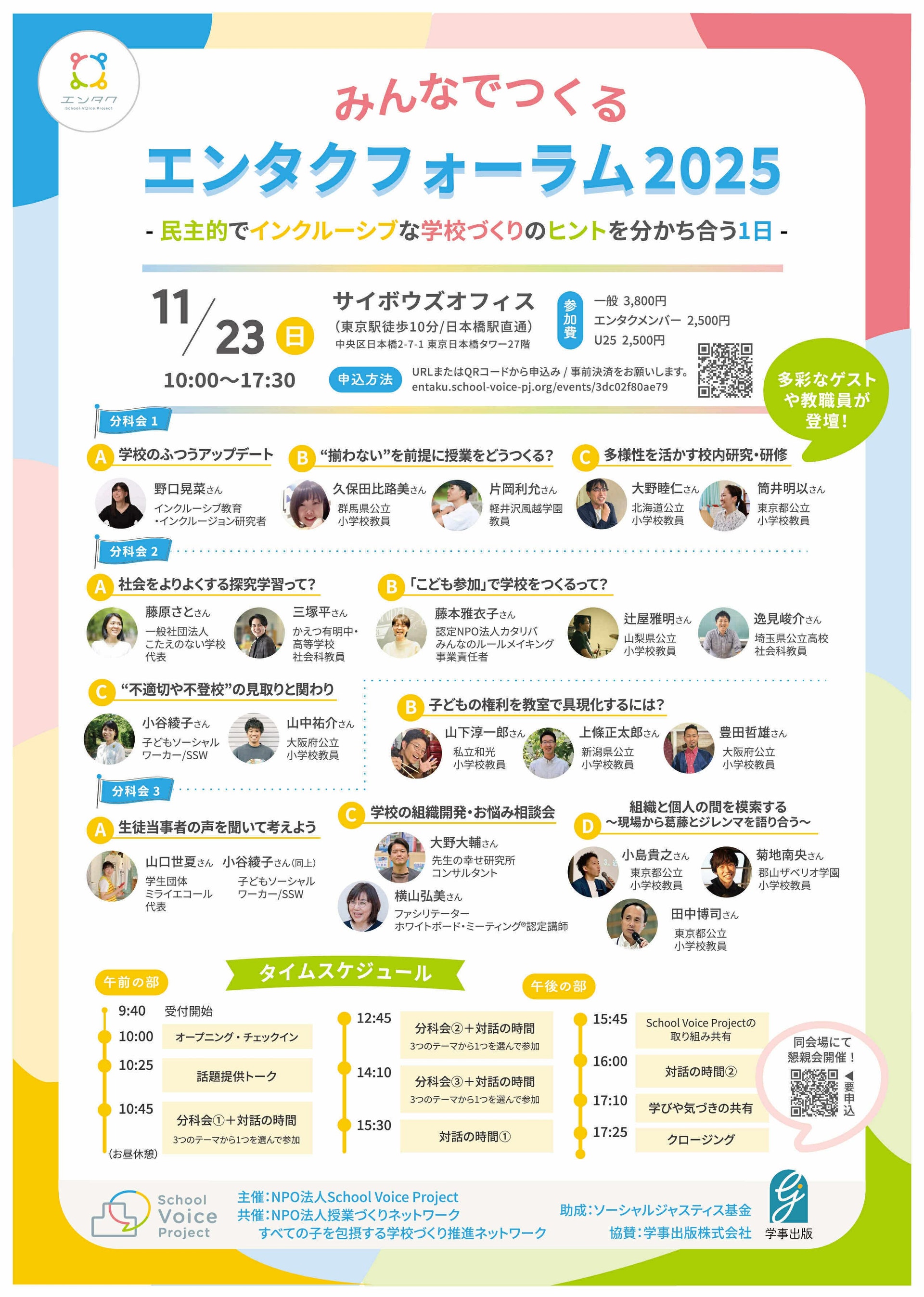 エンタクフォーラムは現場の教職員の皆さんをはじめ、多様な関係者が集い、思いと具体的な知恵を分かち合ってつながり、ともに「子どもも大人も幸せな学校」「民主的でインクルーシブな学校」をつくっていくための場です。