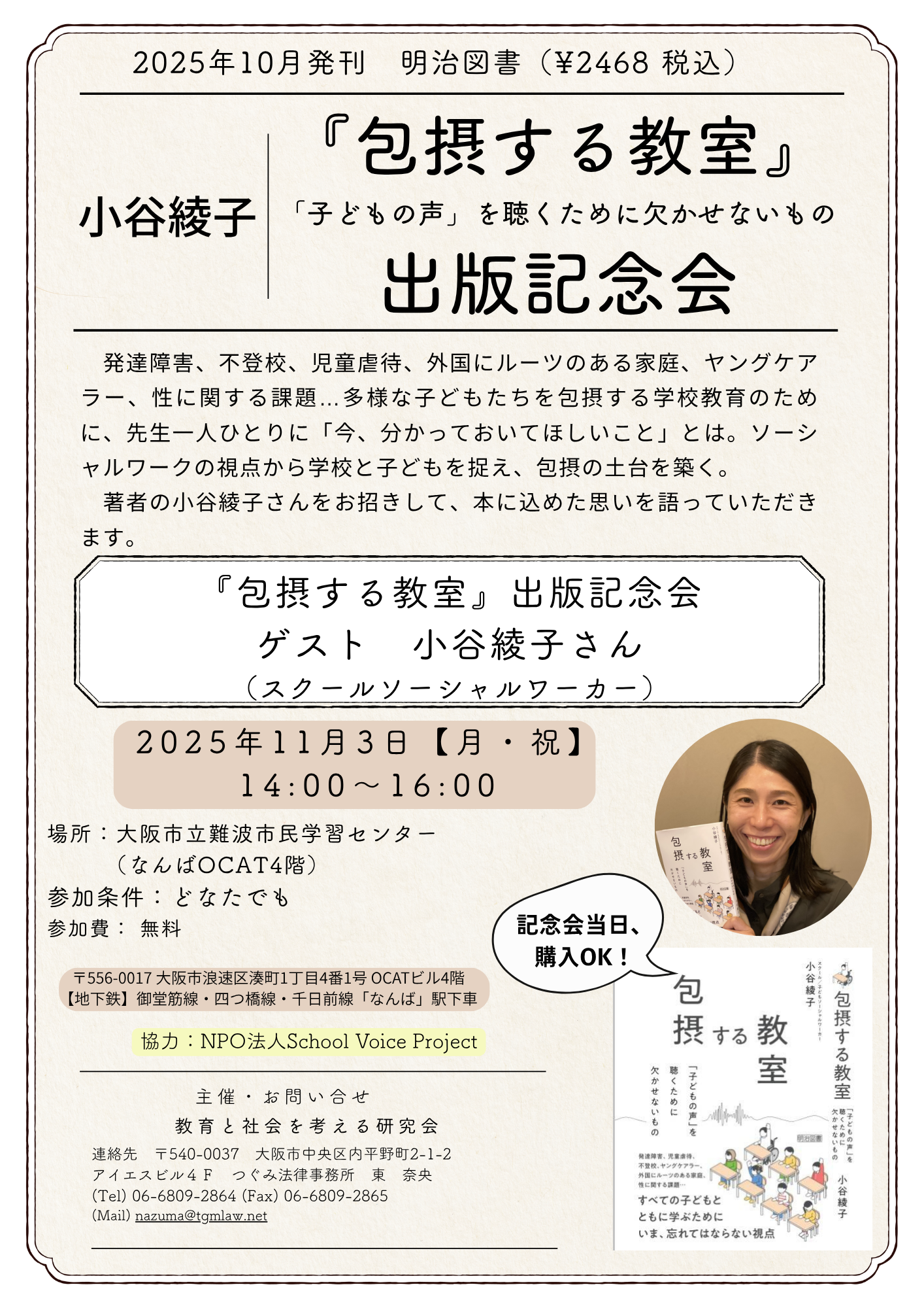 SVPの理事で、スクール/子どもソーシャルワーカーの@あやこさんの単著『包摂する教室 -「子どもの声」を聴くために欠かせないもの-』が出版されます!